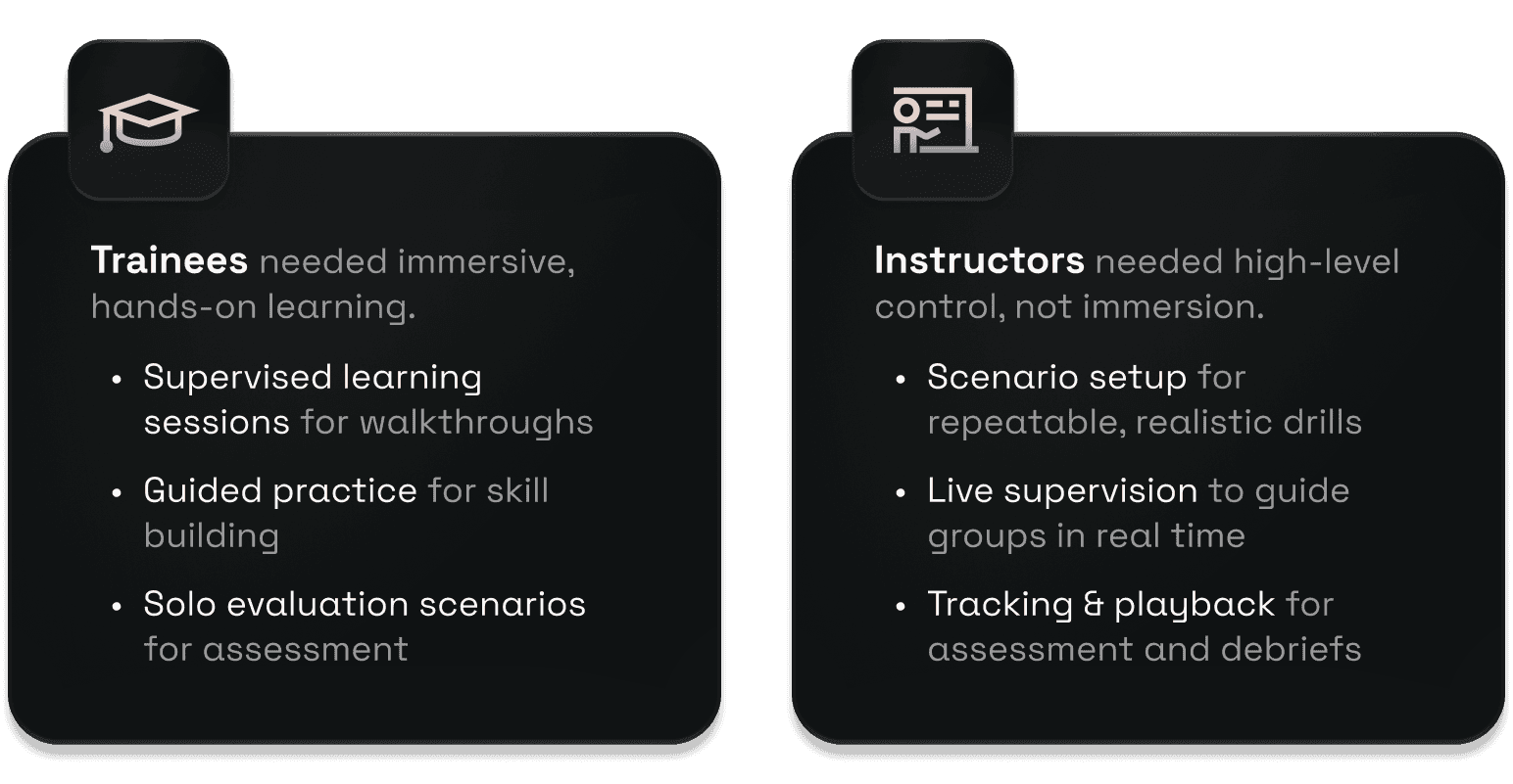 We were designing for two distinct user types: instructors and trainees, each with very different goals and levels of interaction.